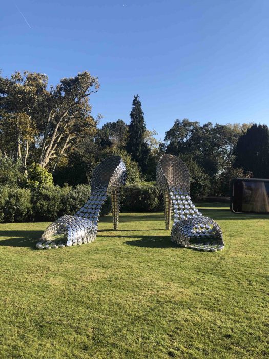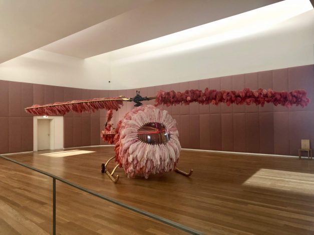 Em Serralves, fomos ver a exposição de Joana Vasconcelos, I’m your mirror. Esta exposição reúne mais de 30 peças, datadas de 1997 até à atualidade, cobrindo duas décadas de prática artística e analisando o seu desenvolvimento como artista. Inclui muitas das suas obras mais conhecidas, como a Cama Valium (1998), A noiva (2001–05), Burka (2002), Coração independente vermelho (2005),  Marilyn (2011) e Lilicoptère (2012), assim como novos trabalhos criados para esta mostra, como Finisterra, I’ll Be Your Mirror ou Solitário (todos de 2018). A exposição estende-se até aos jardins do Parque de Serralves através de monumentais esculturas de exterior.